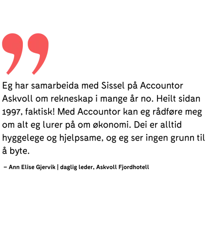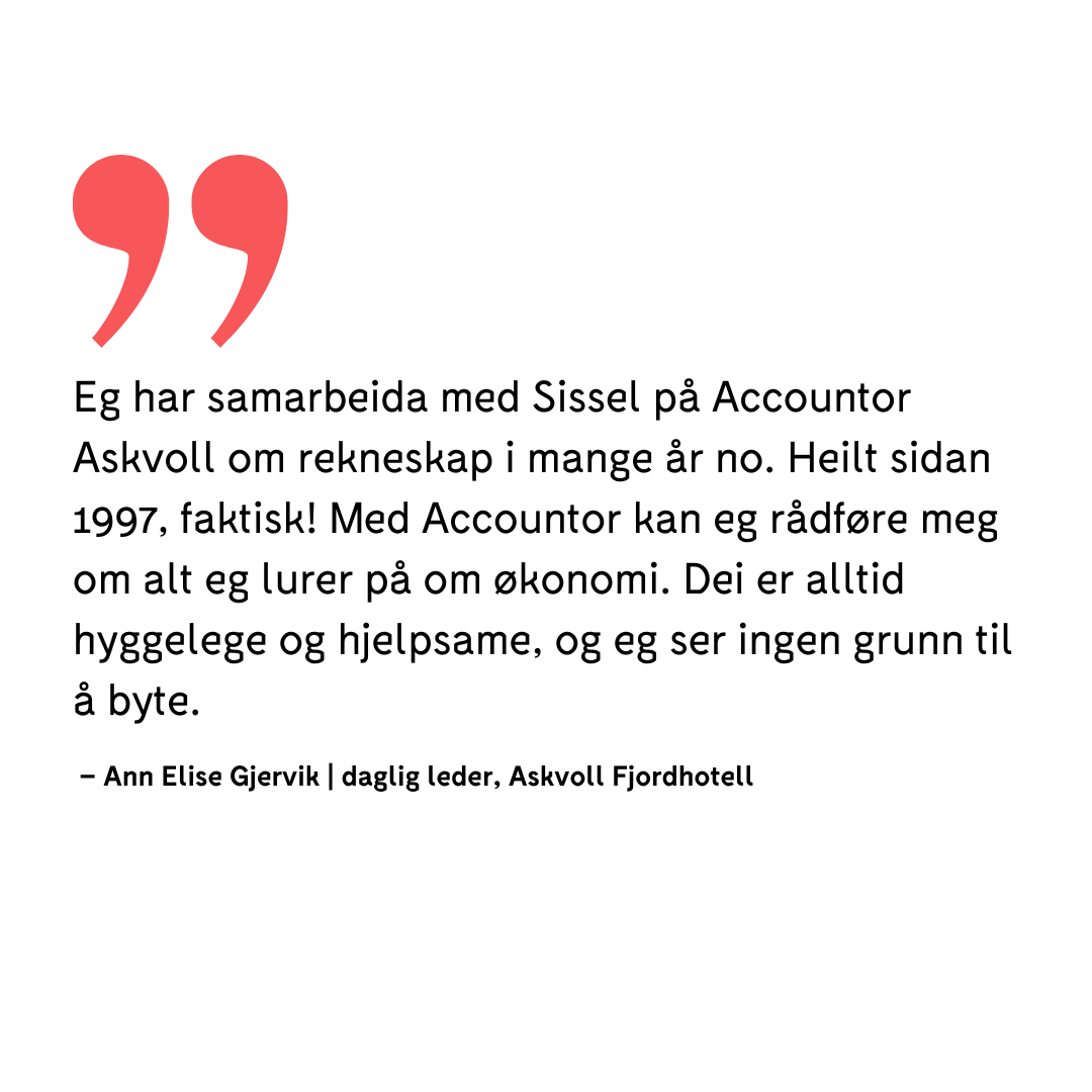 Accountor Askvoll tilbyr problemfrie og sikre løysingar for framtida, slik at du kan fokusera på kjerneverksemda. Vi veit kor viktig det er å ha ein påliteleg rekneskapsførar og økonomisk rådgivar, og vi jobbar hardt for å vera nettopp det for deg.